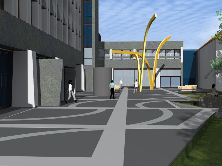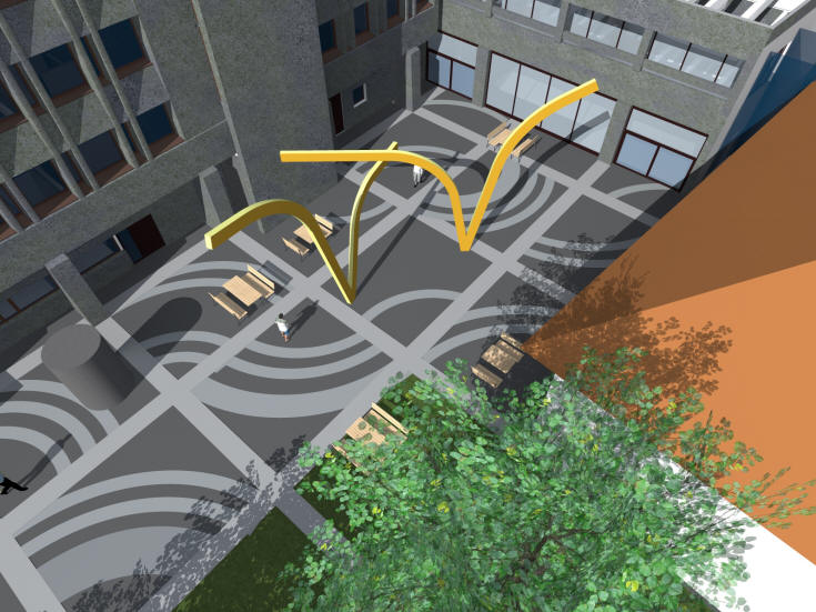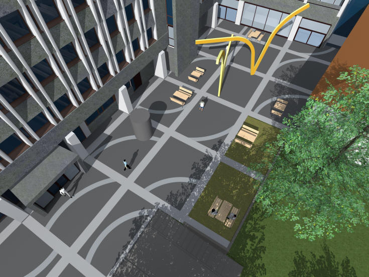 and helps to integrate the square with the large, busy urban